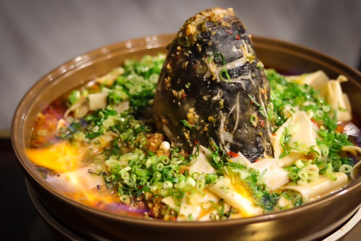 當天餐期最吸睛非「鴻運當頭」莫屬,主廚精選重約6斤的大鰱魚頭,以雲南汽鍋裝盛,加入大量剁椒、蒜泥提味,有別傳統將魚頭立著入鍋蒸熟,甫上桌,由專人進行點火儀式,現場瞬間儀式感滿滿,軟滑魚肉吸附湯汁精華,鹹中帶香超美味,建議先從魚肉吃起,再放入褲帶麵小火快煮,讓人愈吃愈過癮。