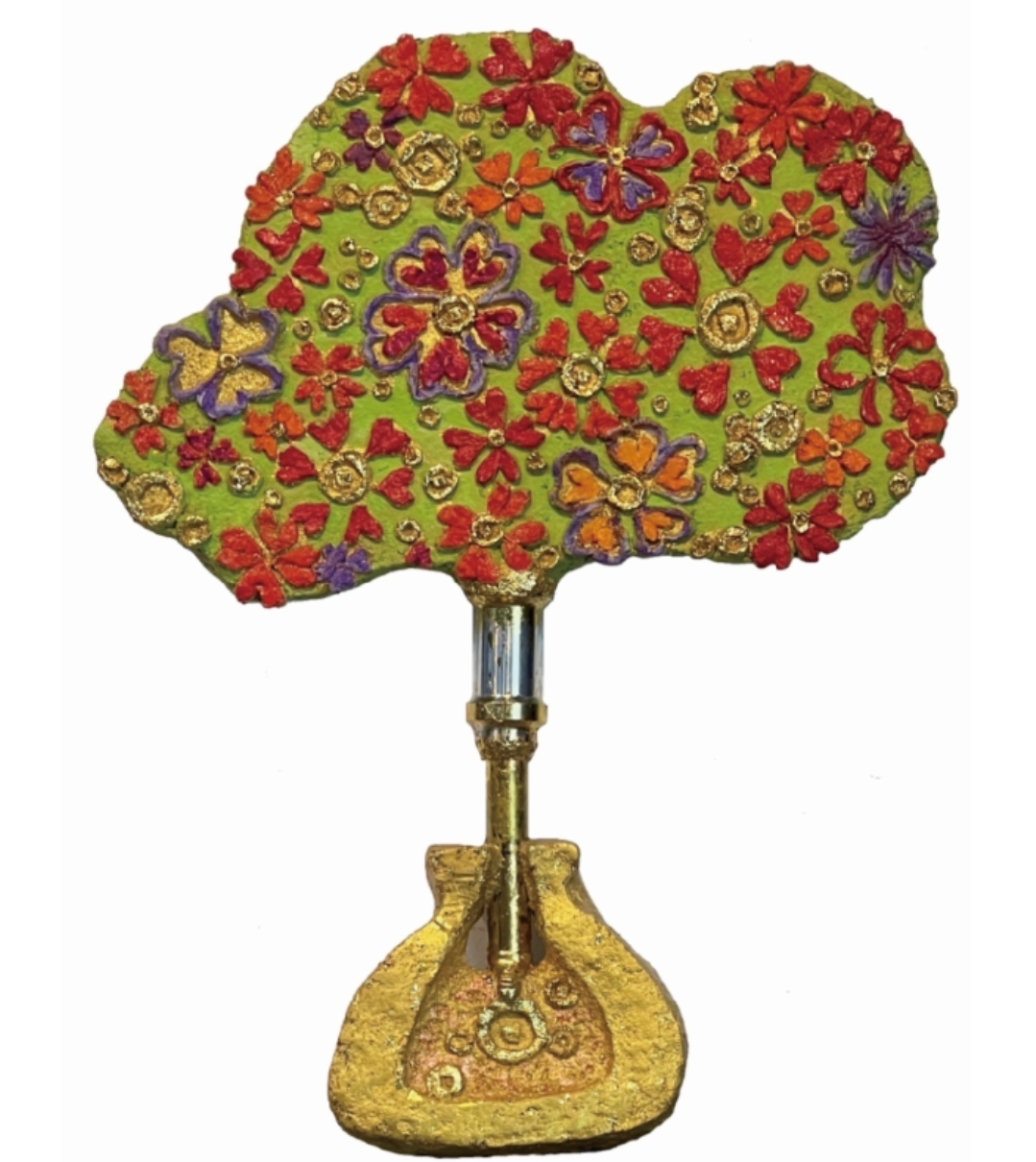 二○一二年,我在瀋陽做了一個很大的城市景觀雕塑,遇到當地開發商,邀請我創作特別的作品送給股東會議的成員們。我思考這些人喜歡的是什麼呢?靈感所致,便把錢的符號與愛的符號合體,古錢幣中央有一半是女生一半是男生接吻而成的愛心,意思是錢會生錢,此後打開了能量創作的任意門,「錢」與「愛」符號成為我創作上的重要元素。