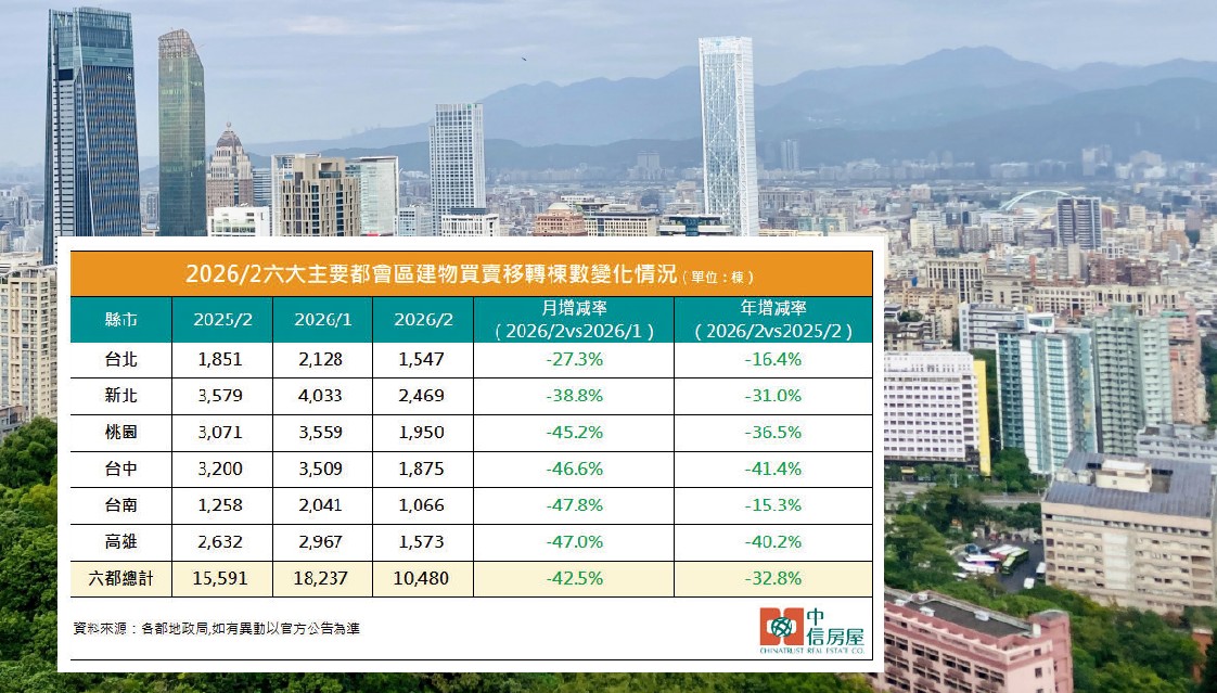 從整體數據來看,二○二六年前兩月房市呈現「量縮但不崩」的格局。中信房屋統計顯示,全台交易量年減約三%,六都合計建物買賣移轉棟數為二八七一七棟,年減三.七%,整體仍屬溫和修正範圍。