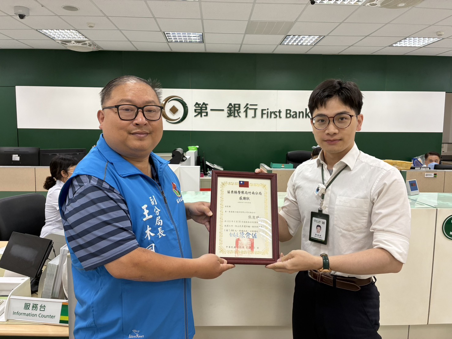經警方了解,54歲謝姓男子透過臉書認識女網友,後續再以通訊軟體聯繫並逐漸建立信任關係,該名女網友隨後以身體不適、急需醫藥費為由,向謝男請求金錢援助,並要求匯款新臺幣1萬7,000元至境外帳戶。謝男依指示前往銀行辦理匯款時,行員察覺異狀並通報警方,經員警到場耐心勸說後,謝男驚覺受騙,當場取消匯款。為表揚行員機警作為,竹南分局副分局長王木風特別頒發感謝狀,肯定其即時通報、成功攔阻詐騙之善舉。